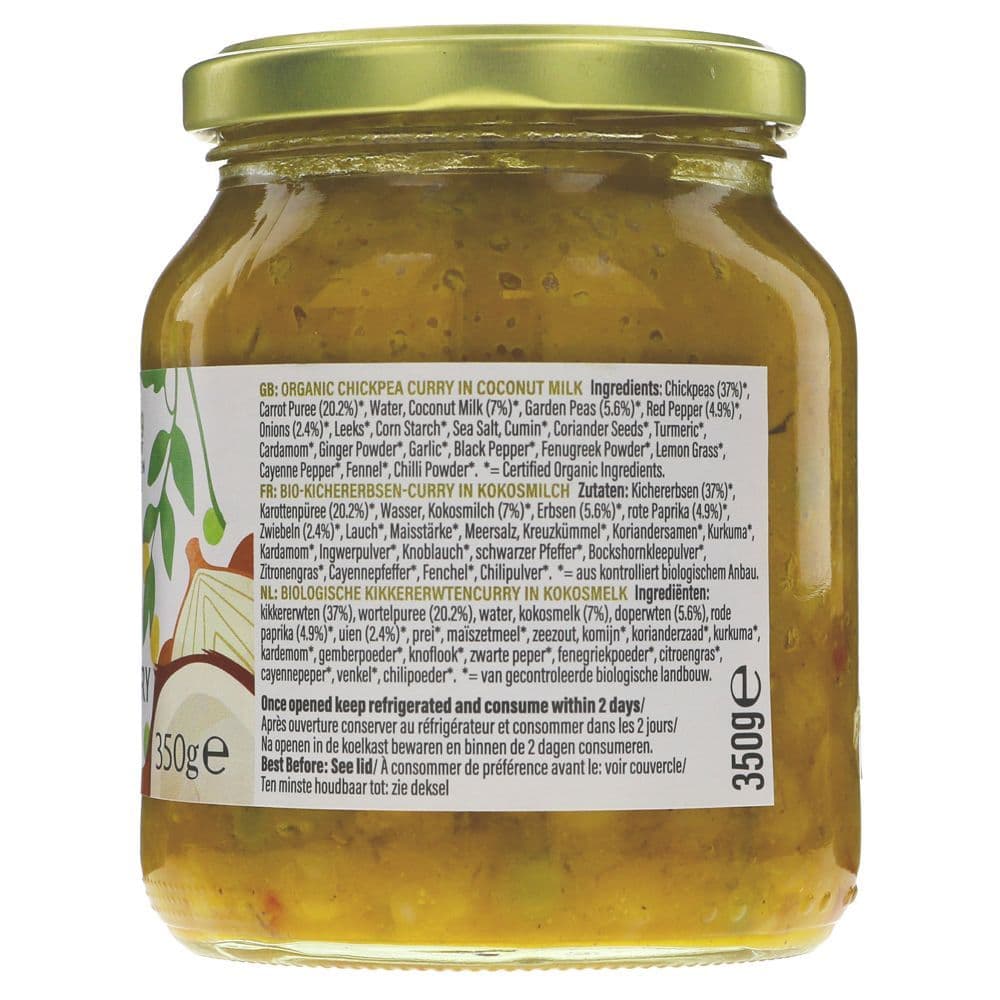 A rich and creamy coconut curry with chickpeas, garden peas and carrots, delicately spiced with turmeric, cumin and ginger. Organic, plant-based and naturally high in fibre and protein - a wholesome meal, ready in minutes.